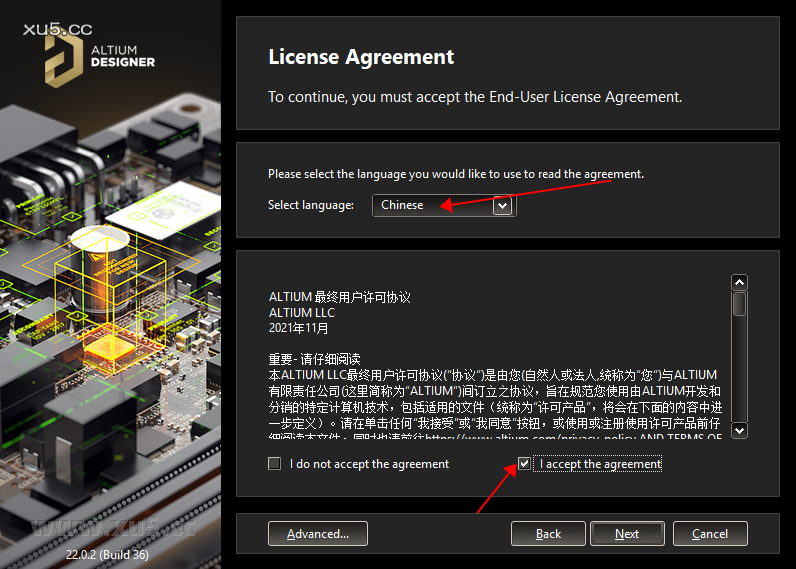 3 在Select language栏下拉列表中选择“Chinese”语言,然后勾选安装许可协议