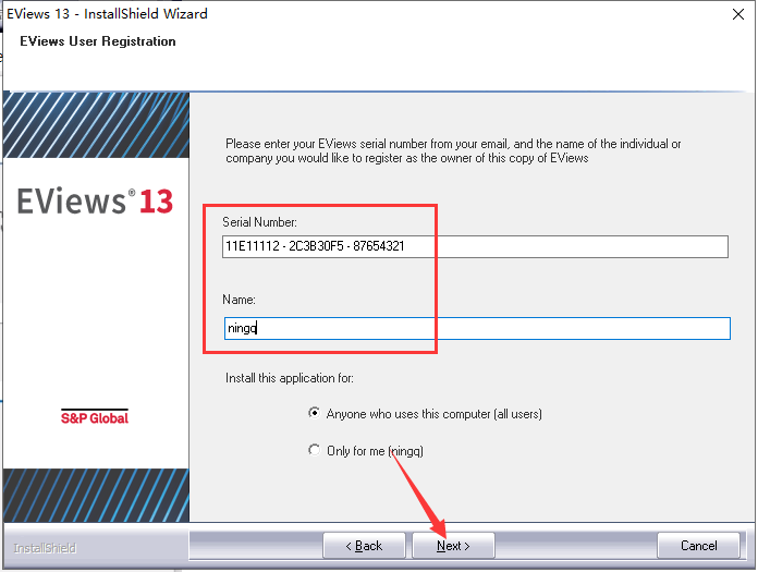 8.输入 Serial Number【11E11112 – 2C3B30F5 – 87654321】和 Name【随意输入】,点击【Next】。