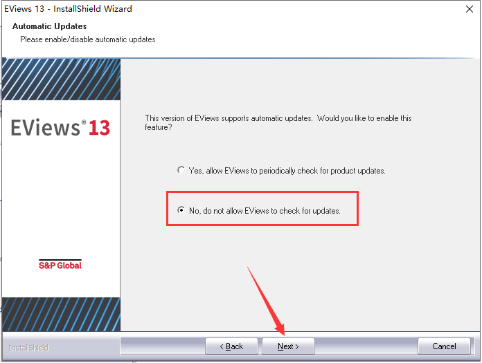 10.自动更新,选择 “No”,然后点击 Next。