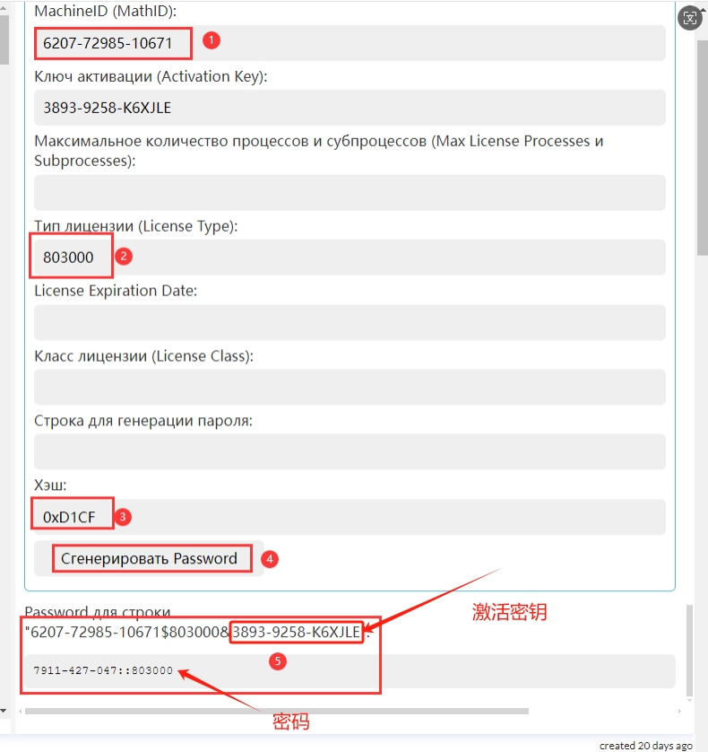 17.(1)将刚才在软件页面复制的【MachinelD】粘贴进来 (2)License Type输入:803000 (3)散列输入:0xD1CF (4)点击【Cгeнepиpoвaть Password】 (5)然后就可以生成激活密钥和激密码