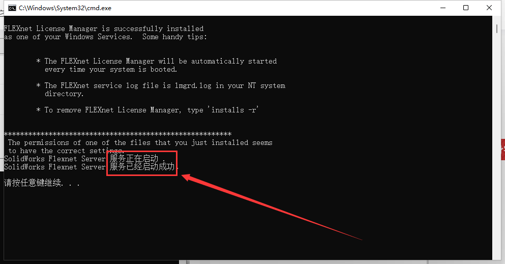 SolidWorks Flexnet Server 服务启动,等待启动成功,然后按随意键退出!如果启动失败的话,就先运行一下 server_remove.bat,再运行 server_install.bat,并且注意电脑名称不能用中文