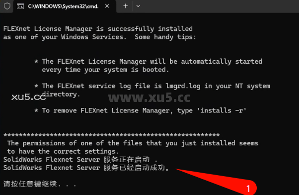 SolidWorks Flexnet Server 服务启动,等待启动成功,然后按随意键退出!如果启动失败的话,就先运行一下 server_remove.bat,再运行 server_install.bat,并且注意电脑名称不能用中文