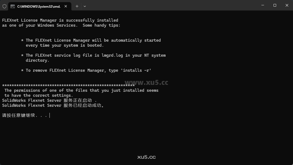 SolidWorks Flexnet Server 服务启动,等待启动成功,然后按随意键退出!如果启动失败的话,就先运行一下 server_remove.bat,再运行 server_install.bat,并且注意电脑名称不能用中文