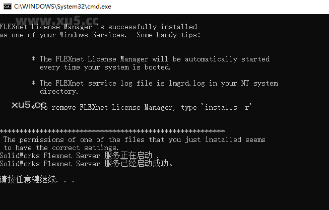 SolidWorks Flexnet Server 服务启动,等待启动成功,然后按随意键退出!如果启动失败的话,就先运行一下 server_remove.bat,再运行 server_install.bat,并且注意电脑名称不能用中文
