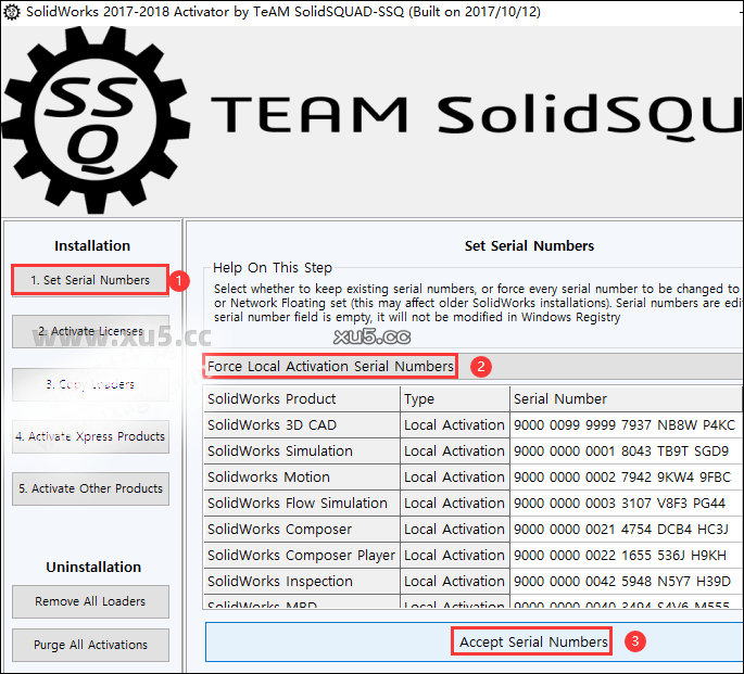 点击【set serial numbers】,然后右侧选择【force local activation serial numbers】,最后点击【accept serial numbers】;