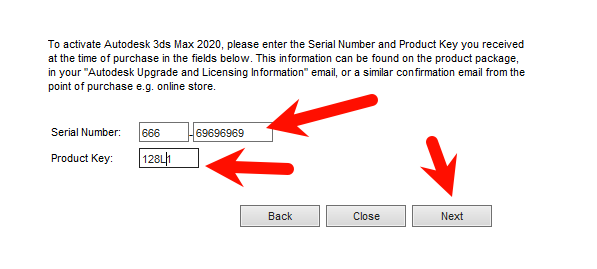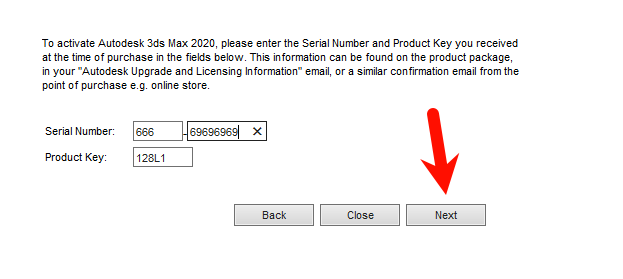 输入3dmax2020序列号和密钥666-69696969,128L1,再点击下一步
