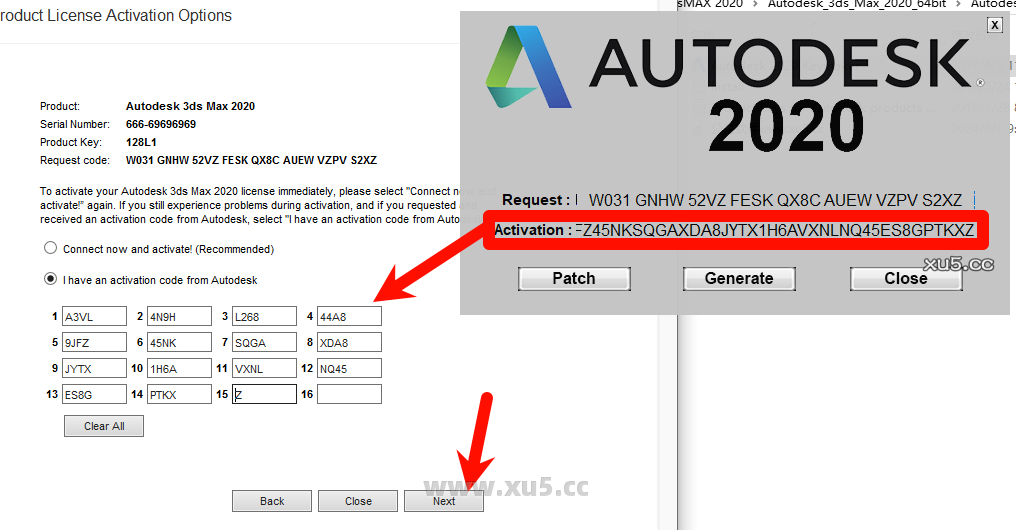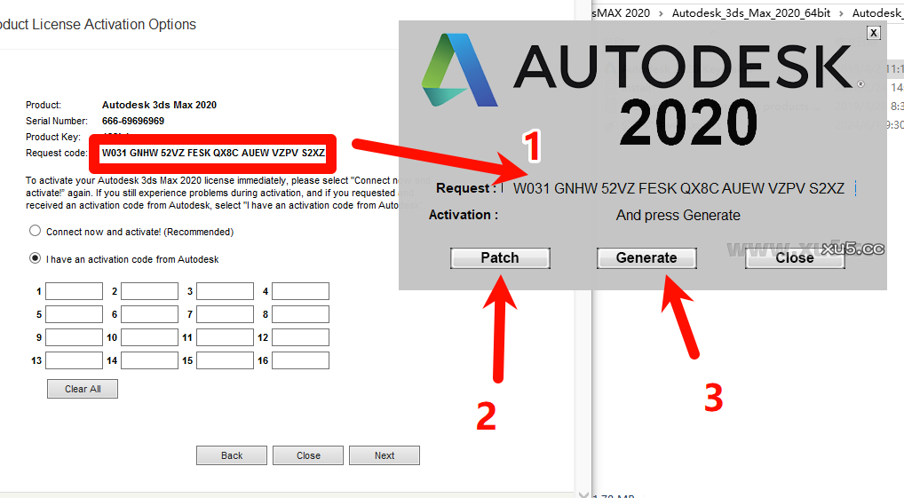 先把3dmax2020激活界面的申请号复制到注册机,点击patch提示然后点击确定,再点击generate生成激活码