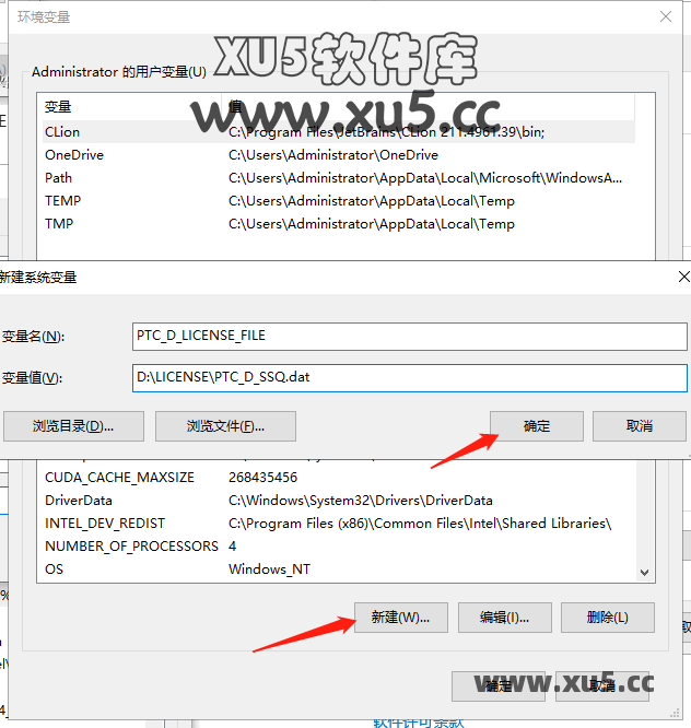点击新建系统变量,在变量名输入【PTC_D_LICENSE_FILE】,变量值输入【D:\LICENSE\PTC_D_SSQ.dat】也就是刚刚生成的那个文件,然后点击确定。