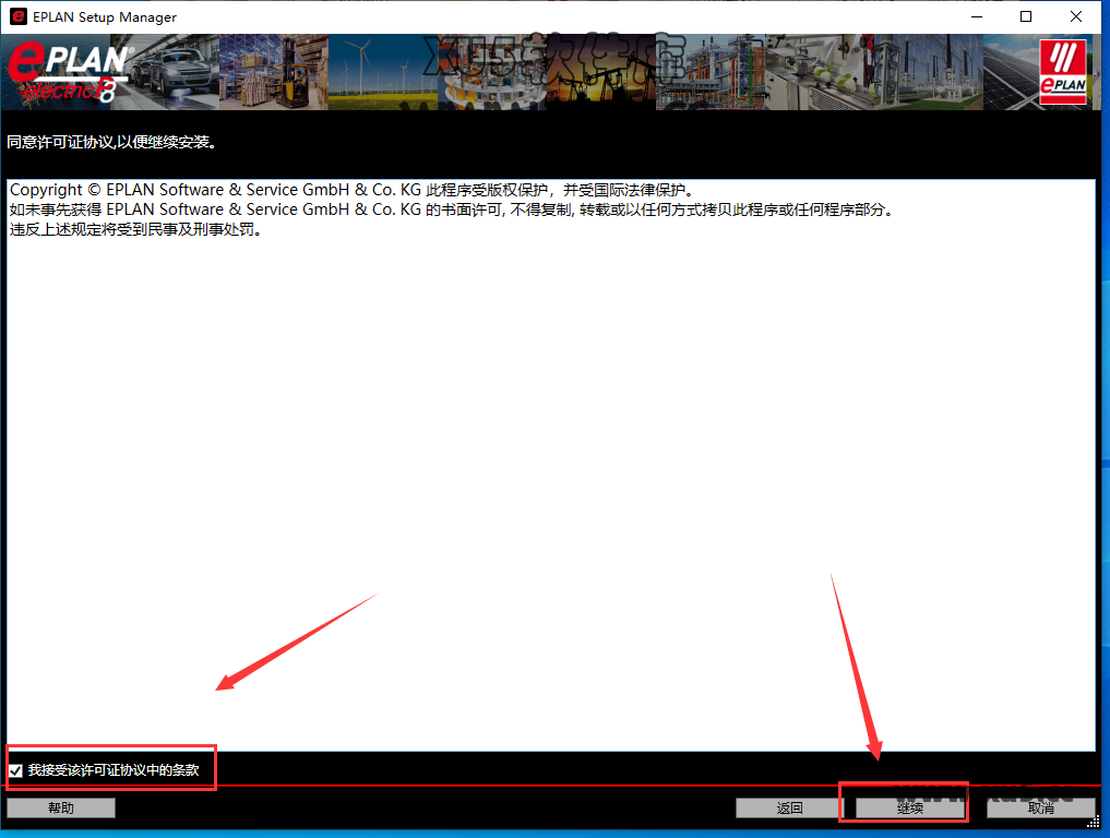 软件许可协议接受,勾选接受的选项,然后点击继续