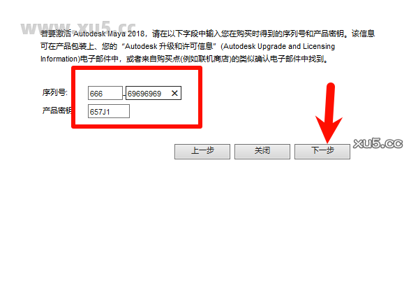 输入产品序列号(666-69696969)和产品密钥(657J1),然后点击“下一步”。